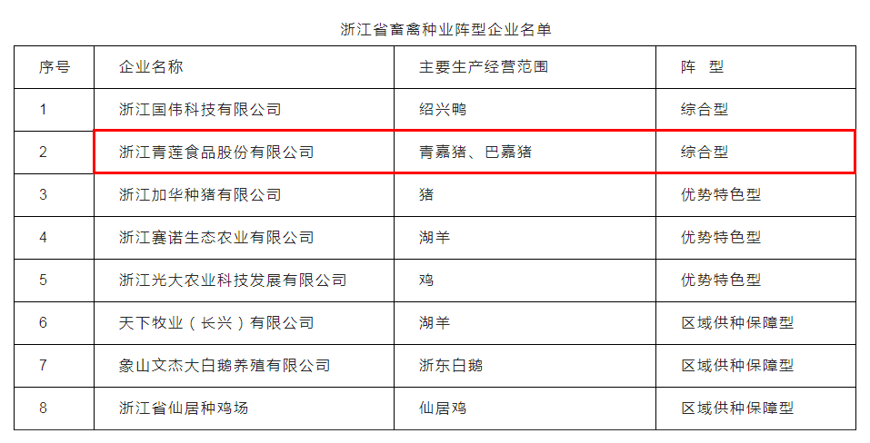 9月14日,浙江省農(nóng)業(yè)農(nóng)村廳、浙江省科學(xué)技術(shù)廳公布了浙江省種業(yè)陣型企業(yè)名單,其中浙江青蓮食品股份有限公司被認定為省畜禽種業(yè)綜合性陣型企業(yè)。