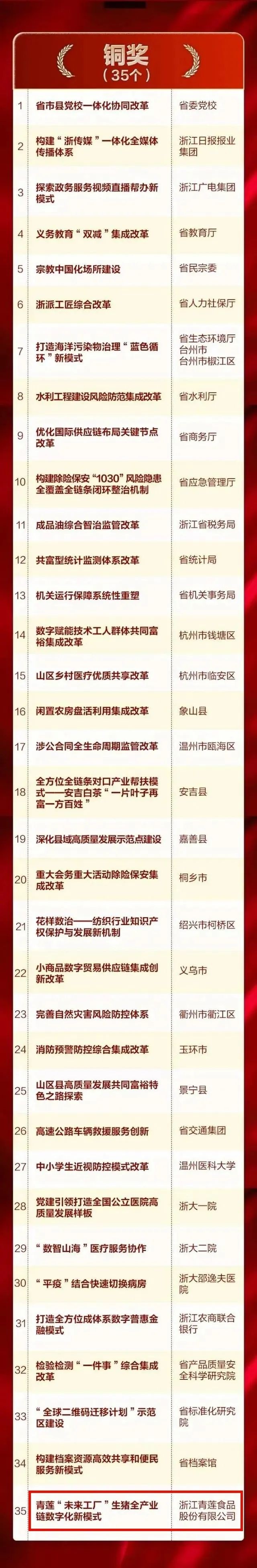 重磅!青蓮食品—膳博士榮獲浙江改革突破獎(jiǎng)銅獎(jiǎng)! 2023-02-02 08:37:26 浙江青蓮食品股份有限公司 瀏覽次數(shù) 7871 近日,浙江省委改革辦公布了2022年度浙江省改革突破獎(jiǎng)名單。浙江青蓮食品股份有限公司“數(shù)智青蓮”未來工廠榮獲2022年度浙江省改革突破獎(jiǎng)銅獎(jiǎng),是銅獎(jiǎng)組中唯一的一家民營企業(yè)。20多年來,青蓮食品構(gòu)建起從農(nóng)場到餐桌的透明全產(chǎn)業(yè)鏈,在改革創(chuàng)新中以種業(yè)為源頭,建立起未來農(nóng)場—未來工廠—產(chǎn)業(yè)新零售等數(shù)字化應(yīng)用,真正從用戶需求出發(fā)為社會提供優(yōu)質(zhì)食品!此次獲得浙江改革突破獎(jiǎng)銅獎(jiǎng),更是對青蓮食品數(shù)字化轉(zhuǎn)型成果的肯定和勉勵(lì)!實(shí)現(xiàn)黑豬專家膳博士在安全和美味雙升級上硬核突破!身為黑豬專家,膳博士服務(wù)過世博會、世乒賽、國際馬拉松比賽,連續(xù)8年為世界互聯(lián)網(wǎng)大會供肉,連續(xù)14年為中國極地研究中心供肉,成為杭州亞運(yùn)會官方生鮮肉類產(chǎn)品供應(yīng)商。以國家級嘉興黑豬和兩頭烏保種場作為種業(yè)基礎(chǔ)繁育國家級優(yōu)質(zhì)新品種,形成完整的黑豬商品體系為消費(fèi)者帶來舌尖體驗(yàn)。近年來,通過智慧養(yǎng)殖為傳統(tǒng)畜牧產(chǎn)業(yè)數(shù)字化轉(zhuǎn)型先行探路,以新一代信息技術(shù)為手段,重塑生豬全產(chǎn)業(yè)鏈生產(chǎn)組織方式和管理服務(wù)模式,構(gòu)建“1+4+N”模型,推動全產(chǎn)業(yè)鏈數(shù)字化轉(zhuǎn)型。產(chǎn)業(yè)零售端以用戶需求為中心持續(xù)推出膳博士黑豬鮮肉鮮制系列產(chǎn)品提升消費(fèi)體驗(yàn),滿足國人對美好生活、品質(zhì)食品的向往。2022年,青蓮智慧牧場首批入選浙江省“未來農(nóng)場”,“數(shù)智青蓮”未來工廠獲全省數(shù)字化改革“最佳應(yīng)用”和全省數(shù)字經(jīng)濟(jì)系統(tǒng)“最佳應(yīng)用”。在全省數(shù)字化改革大會上做匯報(bào)演示,列入全省數(shù)字經(jīng)濟(jì)系統(tǒng)地方特色應(yīng)用目錄,受到央視、省級、市縣級等媒體持續(xù)關(guān)注報(bào)道。 上一條“風(fēng)云浙商”許明曙:人生把一件事做好就很不容易 下一條全國唯一!膳博士·香雪白豬獲2022年度國家新品種認(rèn)定!